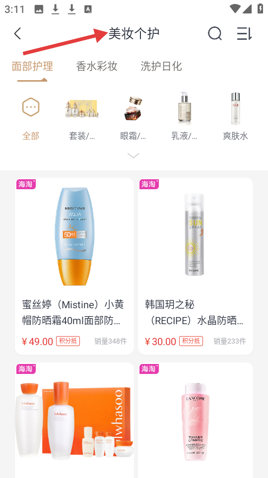 4、美妝個護頁面細分面部護理等板塊,呈現(xiàn)蜜絲婷等品牌商品,標明價格、銷量及積分抵用,滿足用戶美妝購物需求。