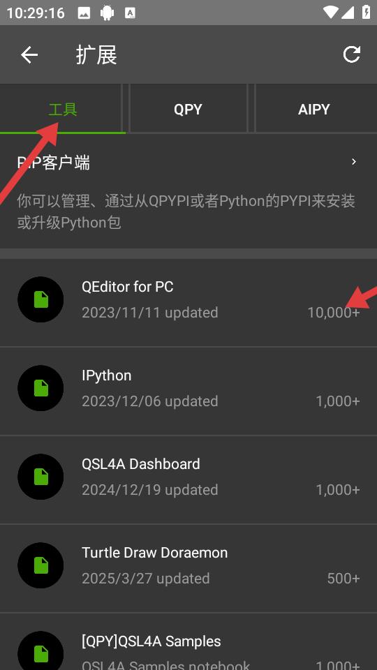 2、進(jìn)入擴(kuò)展板塊PIP客戶端可管理Python包,QEditor、IPython等工具覆蓋開(kāi)發(fā)、數(shù)據(jù)處理、繪圖等場(chǎng)景,豐富的擴(kuò)展資源持續(xù)更新。