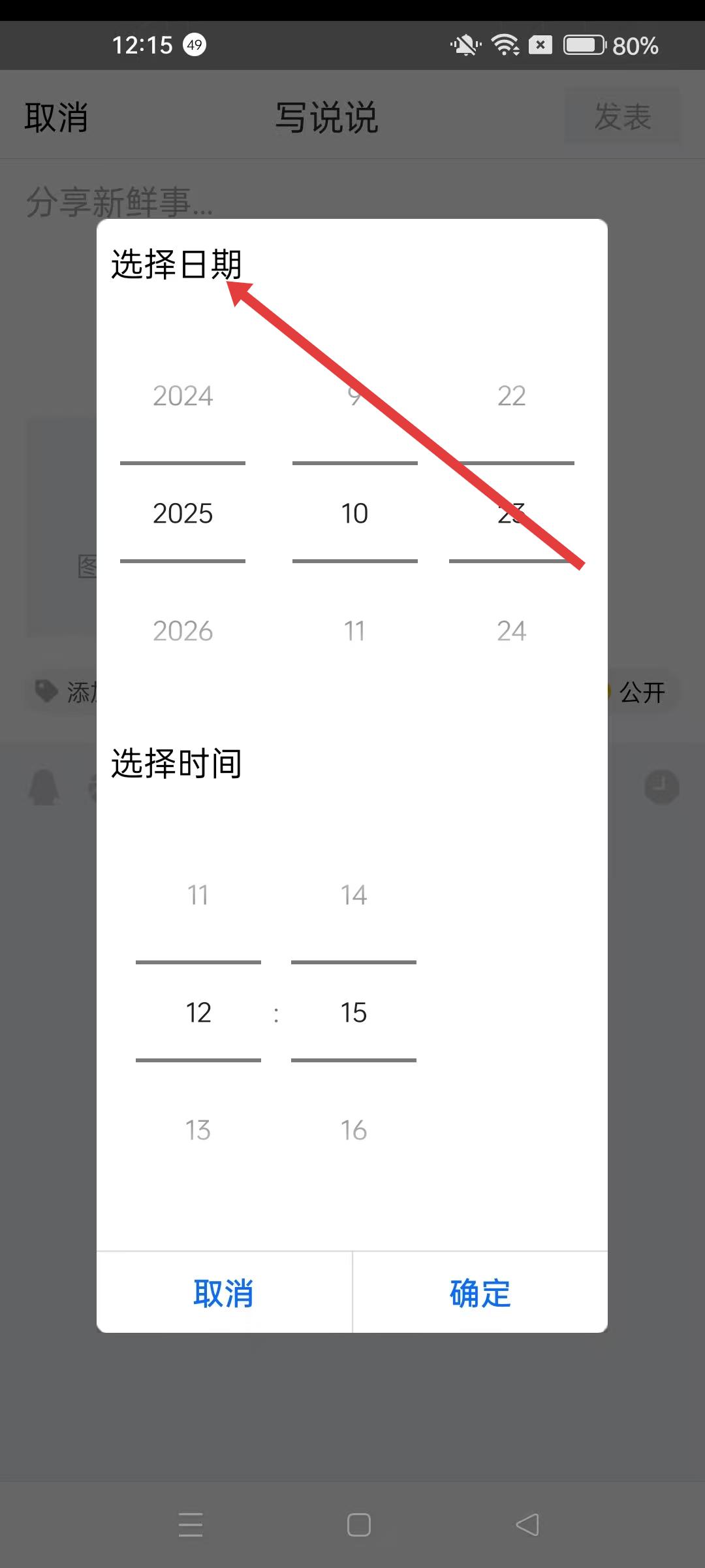 4、若需要設(shè)置說(shuō)說(shuō)的發(fā)布時(shí)間,可點(diǎn)擊時(shí)間設(shè)置選項(xiàng),彈出的選擇日期和時(shí)間界面,滑動(dòng)選擇合適的日期和時(shí)間,設(shè)置完成后點(diǎn)擊確定按鈕。
