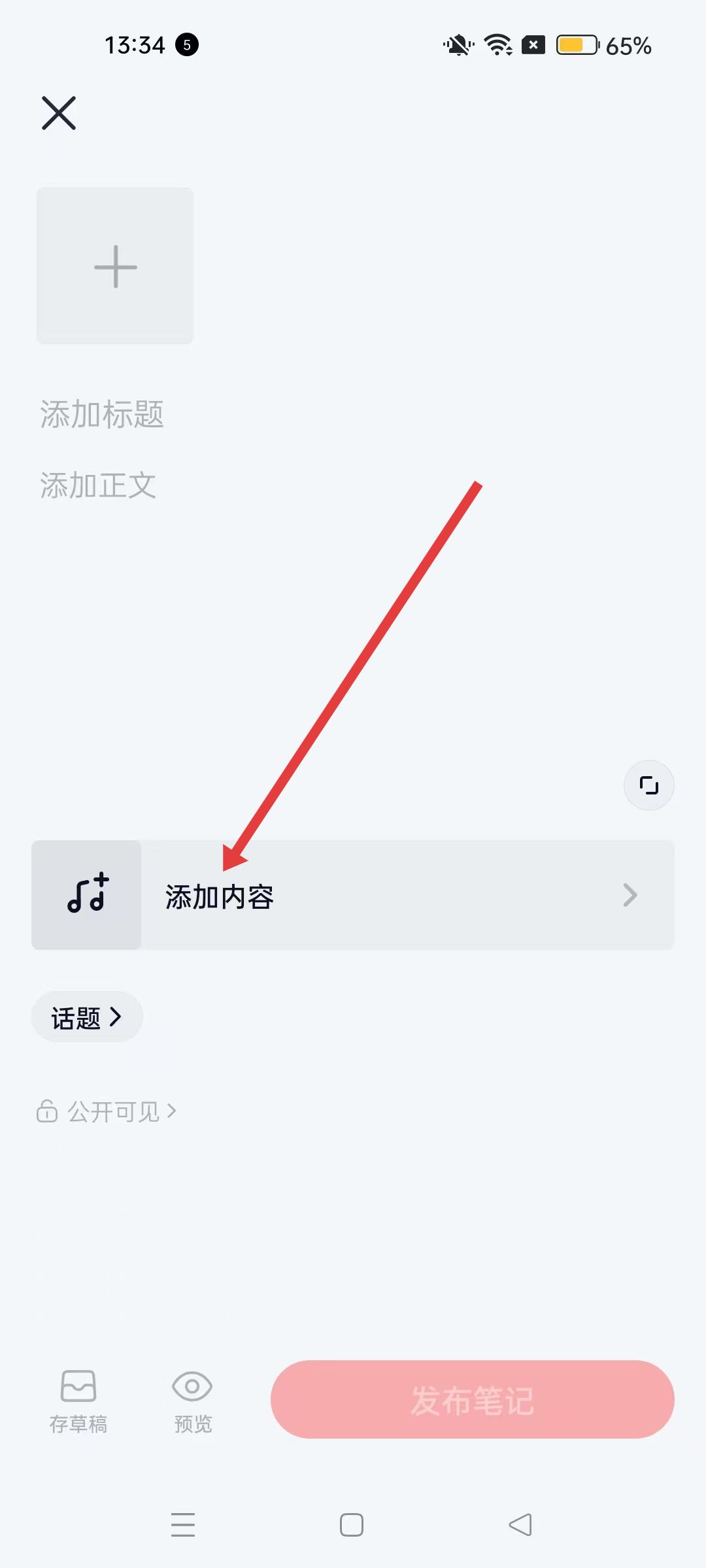 2、筆記板塊點(diǎn)擊右上角紅色號按鈕,進(jìn)入筆記編輯界面,準(zhǔn)備添加音樂內(nèi)容。