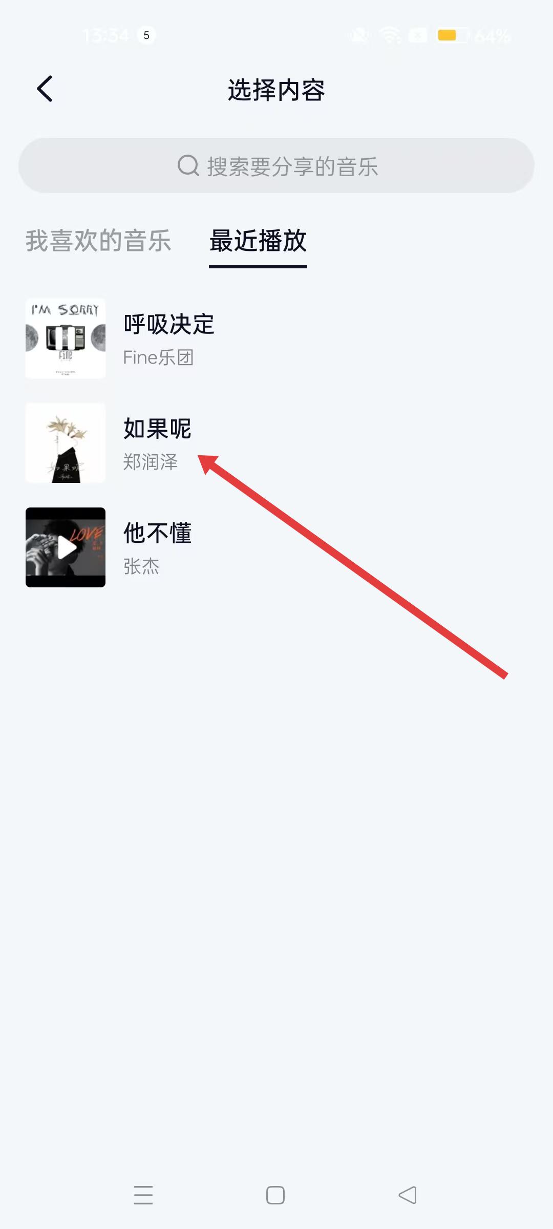 4、選擇內(nèi)容界面切換到最近播放標(biāo)簽,找到如如果呢等音樂,點(diǎn)擊即可將其添加到筆記中。