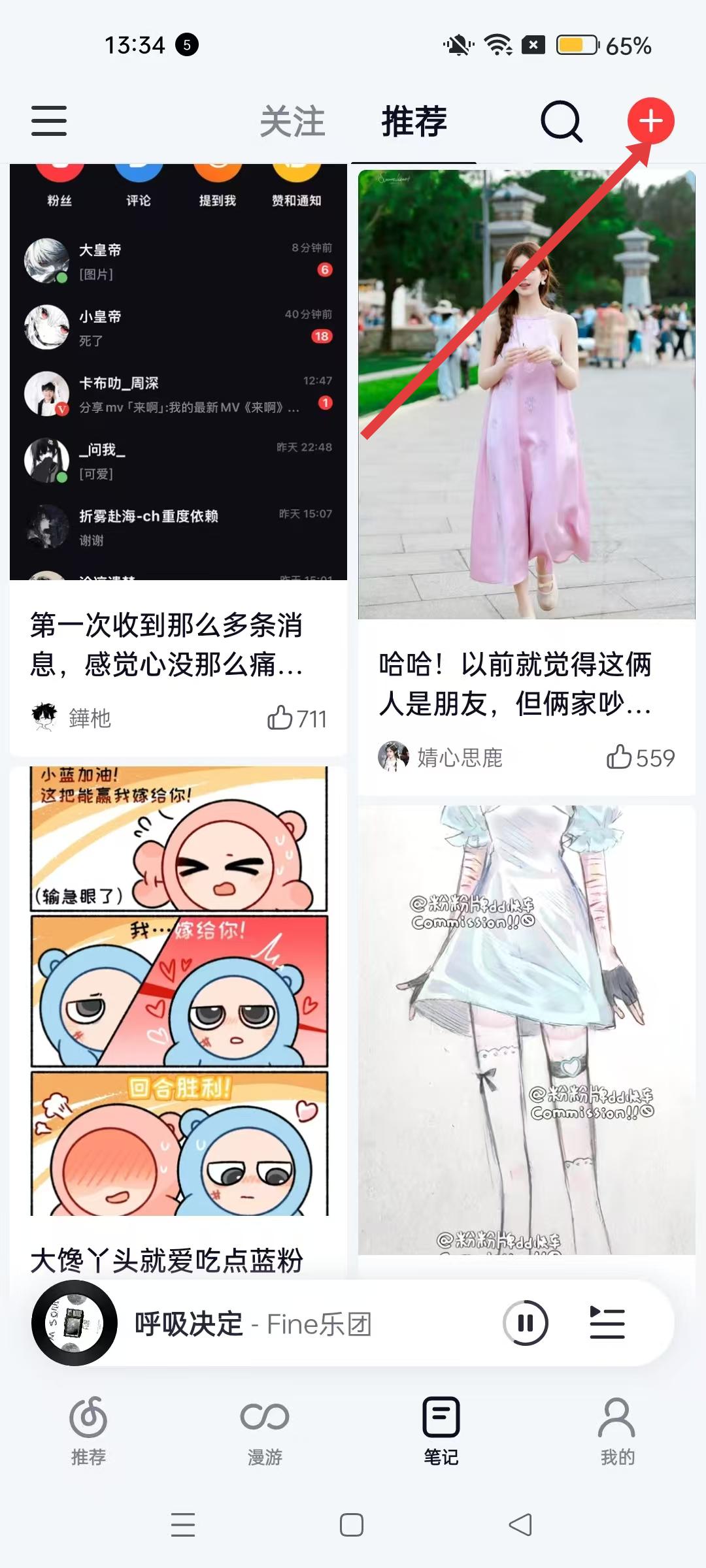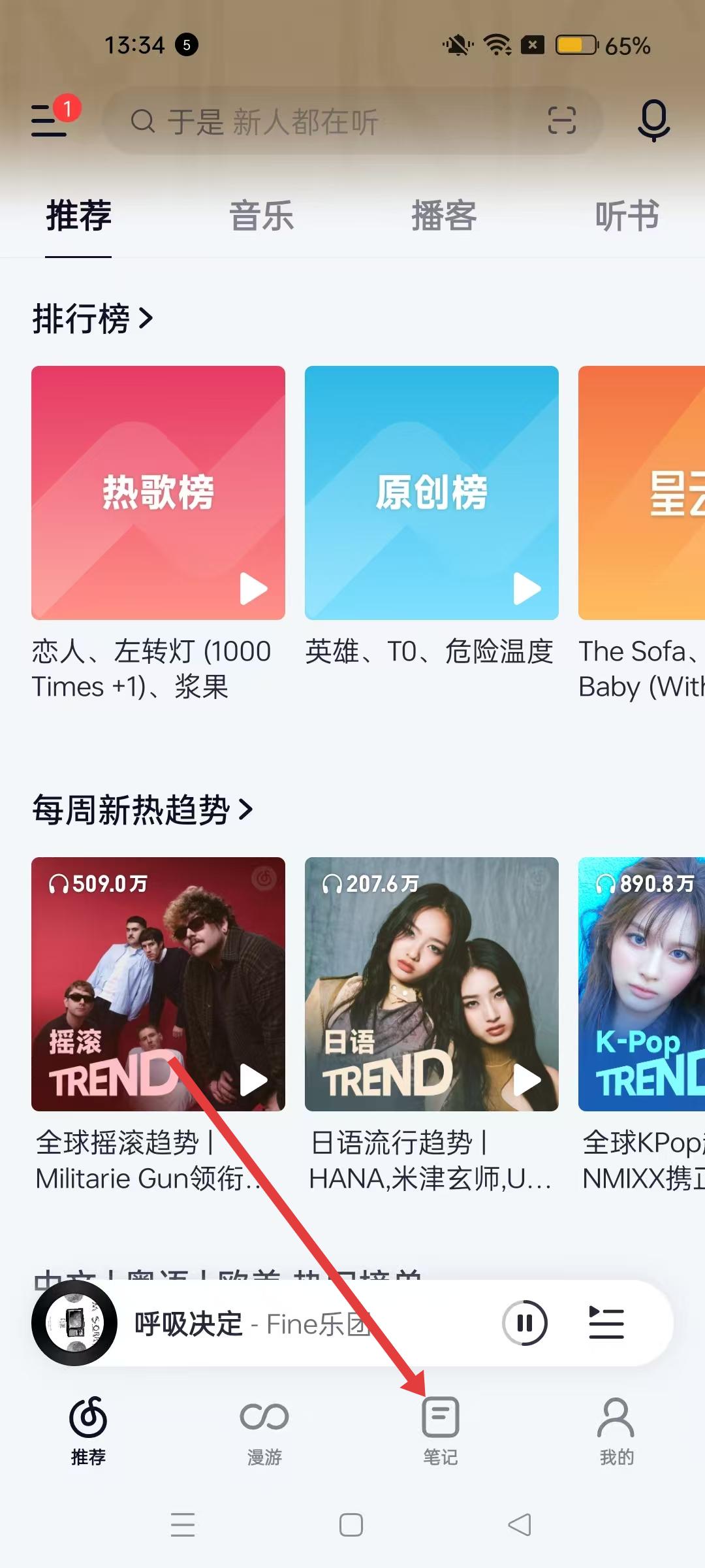 1、進(jìn)入網(wǎng)易云音樂推薦界面,點(diǎn)擊底部筆記按鈕,進(jìn)入筆記板塊開始創(chuàng)作流程。