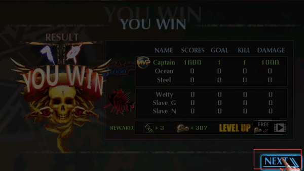 4、當贏得當前比賽,屏幕會顯示YOU WIN以及相關的得分、擊殺、造成傷害等數(shù)據(jù),點擊NEXT按鈕進入下一局比賽。