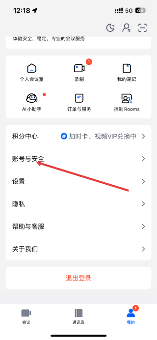 1、打開騰訊會(huì)議,進(jìn)入我的頁面,能看到個(gè)人會(huì)議室、錄制等功能,還有積分中心、賬號(hào)與安全等選項(xiàng),點(diǎn)擊賬號(hào)與安全。