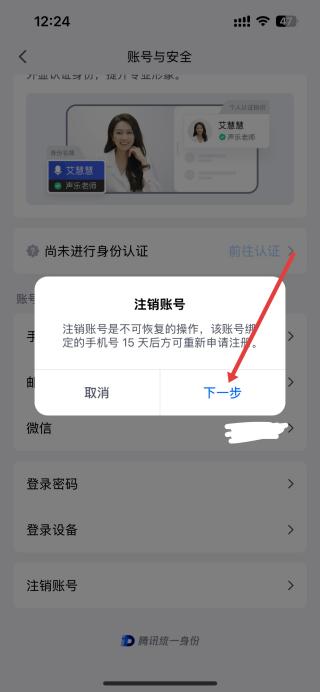 4、點(diǎn)擊注銷賬號(hào)后,會(huì)彈出注銷賬號(hào)提示框,說明注銷后15天內(nèi)該手機(jī)號(hào)不可重新申請(qǐng)注冊(cè),點(diǎn)擊下一步,繼續(xù)注銷流程。