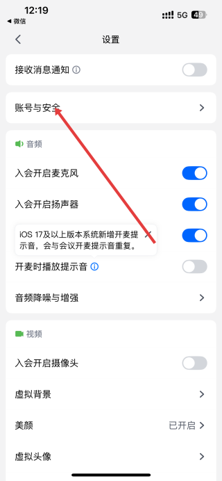 2、進(jìn)入設(shè)置頁面,可看到接收消息通知、賬號(hào)與安全等設(shè)置項(xiàng),再次點(diǎn)擊賬號(hào)與安全。
