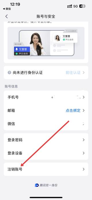 3、進(jìn)入賬號(hào)與安全頁面,能看到賬號(hào)信息,如手機(jī)號(hào)、郵箱等,還有登錄密碼、登錄設(shè)備等選項(xiàng),點(diǎn)擊注銷賬號(hào)。