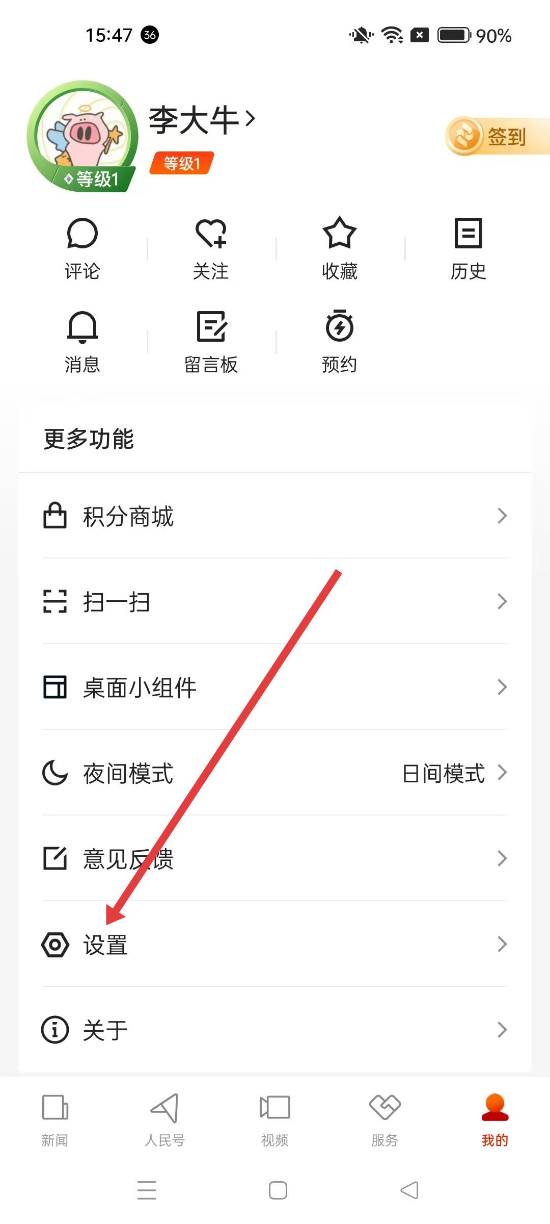 2、我的界面,可看到用戶頭像、昵稱及等級,有簽到入口,還有評論、關(guān)注、收藏等功能選項,點(diǎn)擊設(shè)置可進(jìn)入設(shè)置界面。
