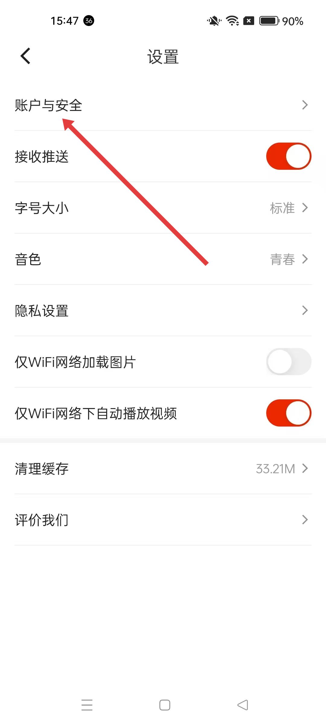 3、設(shè)置界面,有賬戶與安全、接收推送、字號大小等設(shè)置選項,點(diǎn)擊賬戶與安全可進(jìn)入賬戶管理界面。