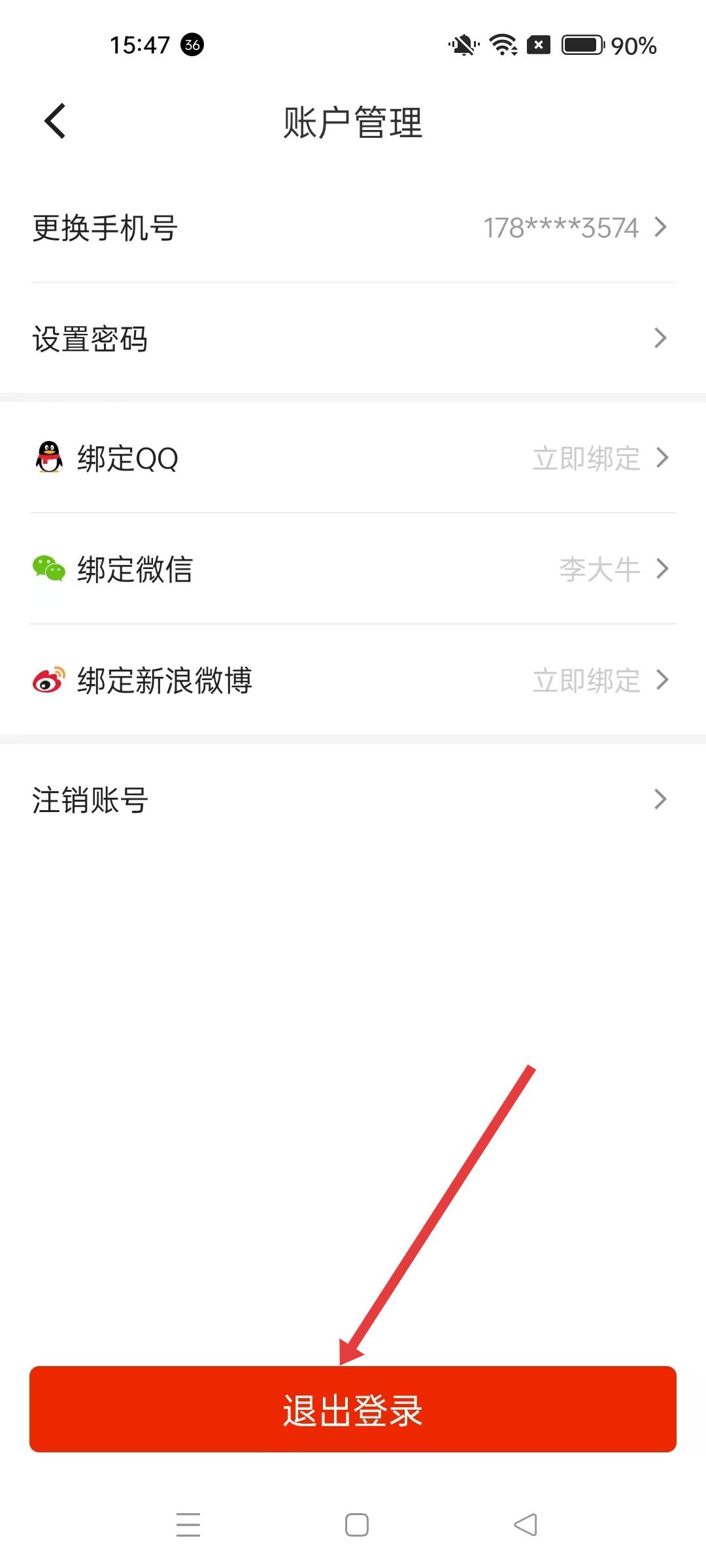 4、賬戶管理界面,可進(jìn)行更換手機(jī)號、設(shè)置密碼、綁定社交賬號等操作,還可選擇退出登錄,方便用戶管理賬戶。