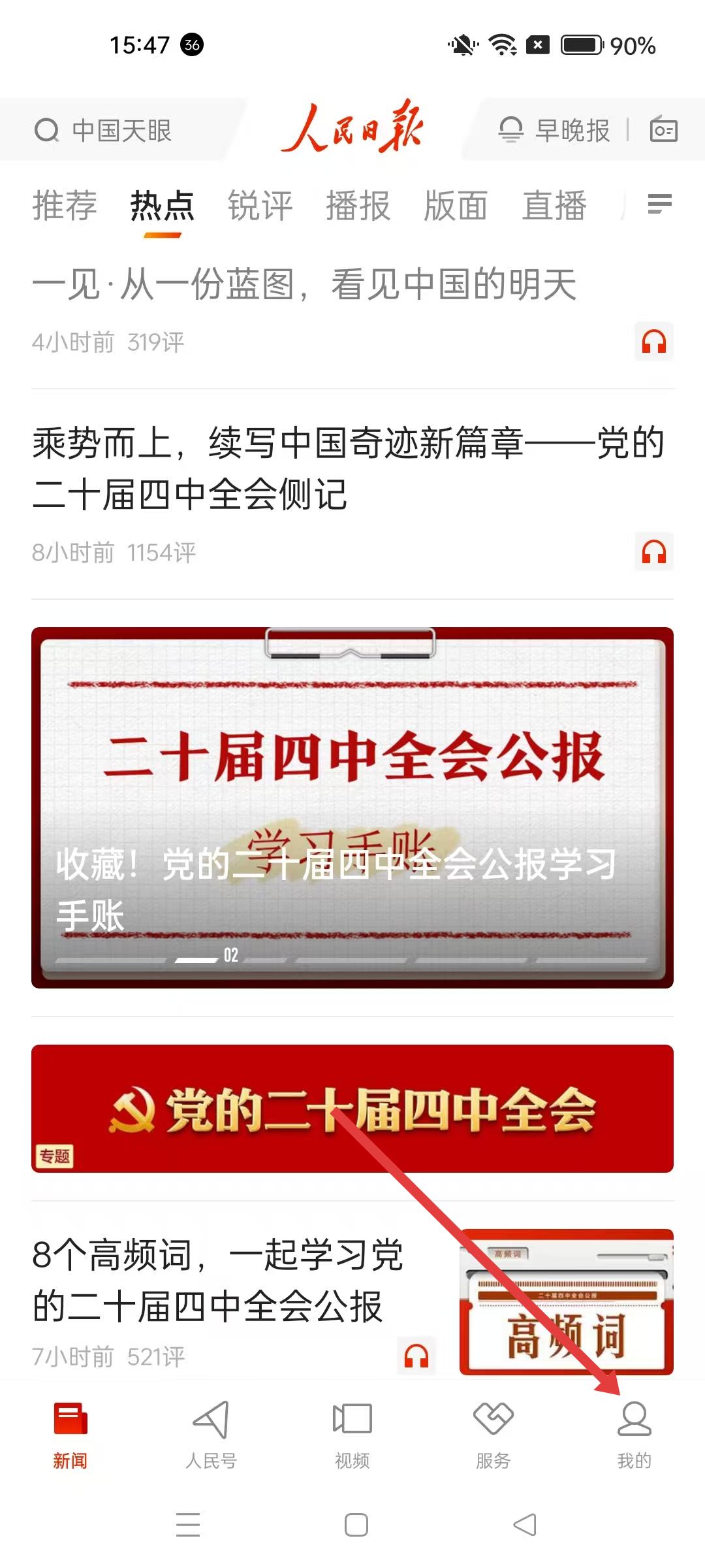 1、進(jìn)入人民日報APP新聞界面,頂部有搜索欄,可搜索新聞內(nèi)容,下方展示熱點(diǎn)新聞資訊,底部有新聞、我的等功能入口,點(diǎn)擊我的可進(jìn)入個人界面。