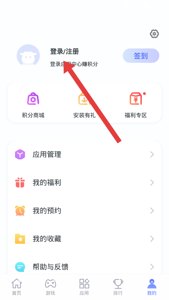 2、在我的頁面找到登錄注冊選項并點擊,該入口可引導(dǎo)進入賬號登錄流程,登錄后能享受賺積分、使用積分商城等專屬服務(wù),整合個人在應(yīng)用商店的相關(guān)權(quán)益與功能。
