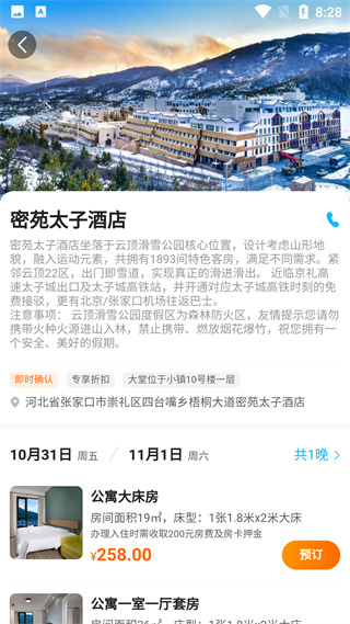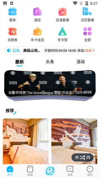 1、首頁(yè)有票務(wù)、酒店等功能入口,可查看公告和最新動(dòng)態(tài)如肖恩懷特相關(guān)活動(dòng),還推薦了特色酒店房型。