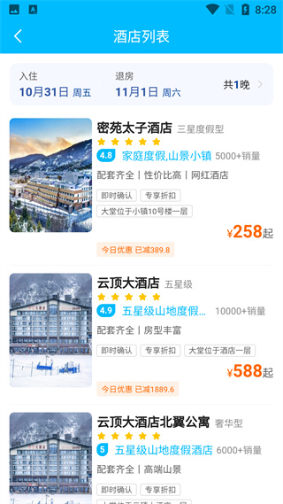 2、酒店列表展示了密苑太子酒店、云頂大酒店等住宿選項(xiàng),標(biāo)注了星級(jí)、評(píng)分、價(jià)格及優(yōu)惠信息,入住時(shí)間可選擇。