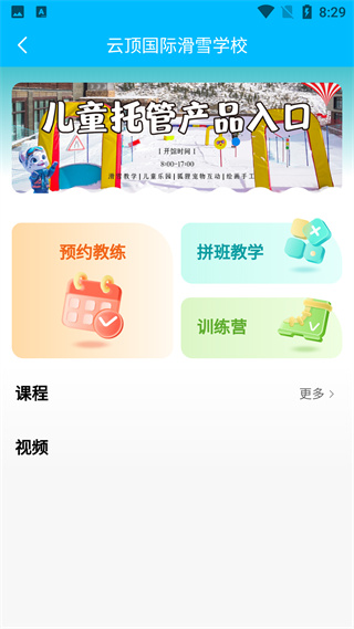 4、云頂國(guó)際滑雪學(xué)校,設(shè)兒童托管產(chǎn)品入口,含滑雪教學(xué)、兒童樂(lè)園等,可預(yù)約教練、參與拼班教學(xué)和訓(xùn)練營(yíng),還能查看課程與視頻資源。