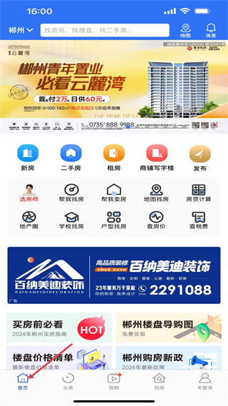 1、首頁功能入口含新房、二手房等,服務(wù)有選房師、幫我找房等,還有2024郴州買房指南等資訊,可找樓盤、二手房。