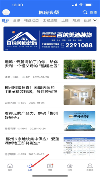 2、頭條頁有資訊、樓盤動態(tài)等分類,展示通鴻?云麓灣、云鼎天闕等樓盤資訊,可了解郴州房產(chǎn)動態(tài)。