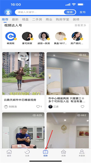 3、視頻頁有樓盤、二手房等分類,展示云鼎天闕精裝現(xiàn)房等視頻,可看房產(chǎn)達人推薦了解房源信息。