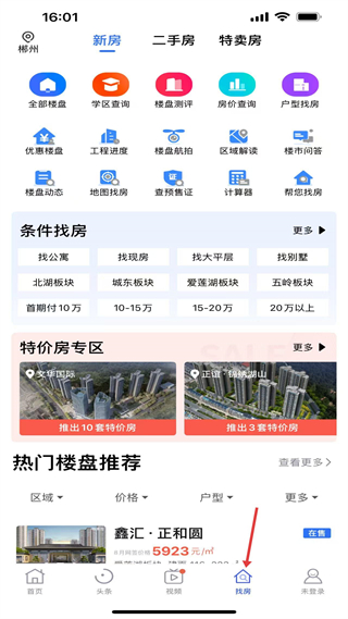4、找房頁有新房、二手房等分類,功能入口含學區(qū)查詢、樓盤測評等,可條件找房,看特價房和熱門樓盤。