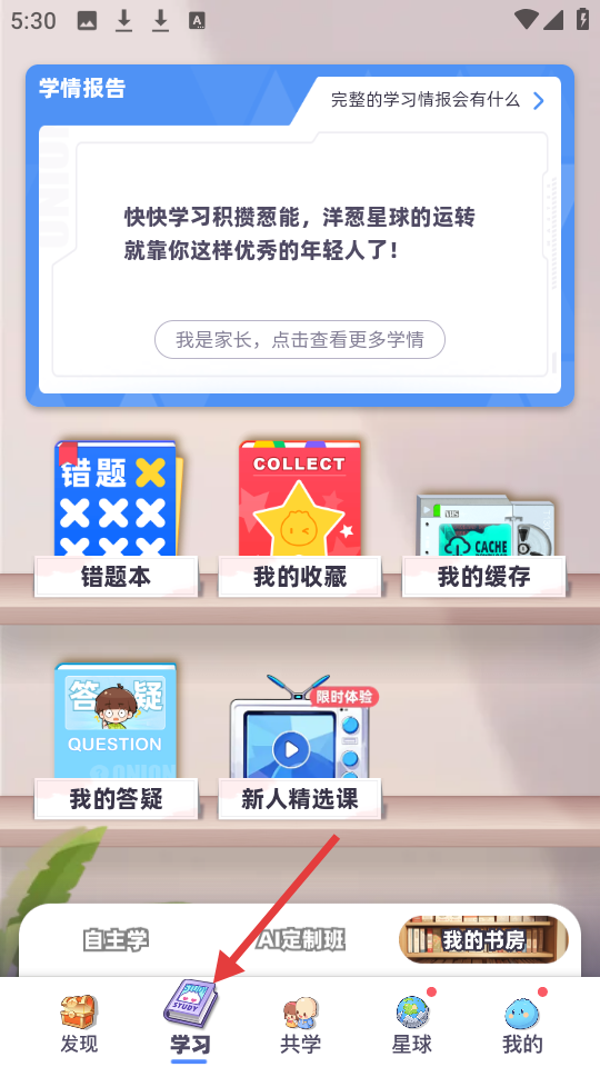 1、學(xué)習(xí)頁(yè)面學(xué)情報(bào)告引導(dǎo)關(guān)注學(xué)習(xí)情況,陳列錯(cuò)題本我的收藏等功能,滿足學(xué)習(xí)記錄與資源管理需求。