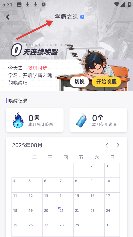 2、學(xué)霸之魂板塊以趣味互動(dòng)形式激勵(lì)學(xué)習(xí),顯示連續(xù)喚醒天數(shù),鼓勵(lì)通過(guò)教材同步開啟喚醒記錄學(xué)習(xí)堅(jiān)持歷程。