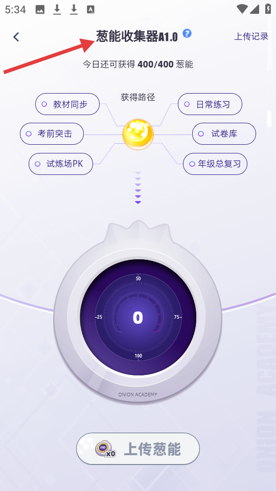 3、蔥能收集器A1.0界面明確當(dāng)日蔥能獲取上限,羅列舉教材同步、試煉場(chǎng)PK等多樣獲取途徑增添學(xué)習(xí)趣味性。