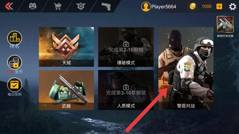 1、進入游戲主界面,有天賦,爆破模式等選項,選擇警匪對戰(zhàn)模式,即可開啟警匪對抗的射擊游戲之旅。
