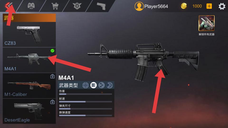 2、在武器界面,可查看CZ83,M4A1等不同槍械,選擇合適的武器,為接下來的射擊戰(zhàn)斗做好準備。