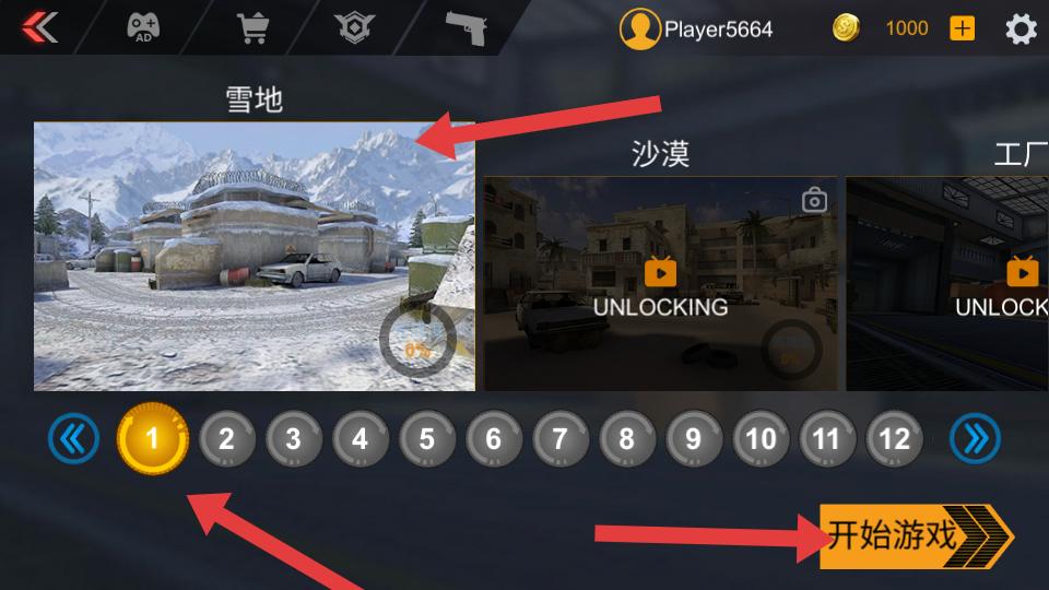 3、選擇游戲場景,像雪地,沙漠等,選好后點擊開始游戲,就能進入對應(yīng)場景,開啟射擊關(guān)卡挑戰(zhàn)。