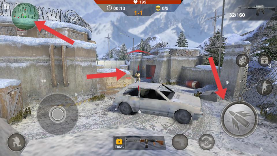 4、進入游戲場景后,利用小地圖觀察敵人位置,操控角色移動,點擊射擊按鈕,攻擊敵人,完成關(guān)卡任務(wù)。