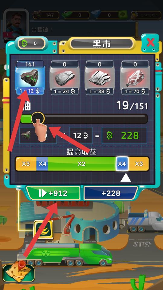 3、進(jìn)入黑市界面,可出售石油等資源,通過滑動(dòng)等操作,選擇要出售的資源數(shù)量,獲取金錢,提升收益。