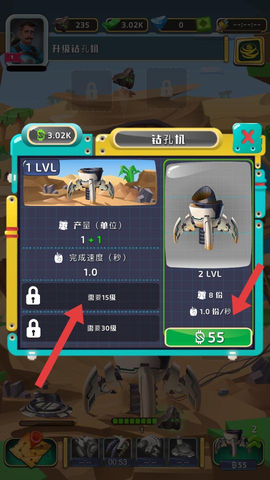 4、在鉆孔機(jī)界面,可查看鉆孔機(jī)的產(chǎn)量,完成速度等屬性,花費(fèi)金錢升級(jí)鉆孔機(jī),提升石油開采效率。