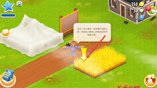 2、農(nóng)場里有小麥地,點擊小麥地,按住鐮刀割小麥,然后在小麥地上持續(xù)滑動,即可收割小麥,獲取資源。