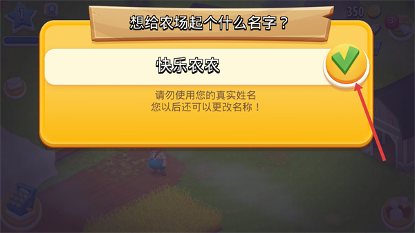 1、創(chuàng)建農(nóng)場時,可給農(nóng)場起名,輸入名字后點擊確認,開啟農(nóng)場經(jīng)營之旅,后續(xù)還可更改農(nóng)場名稱。