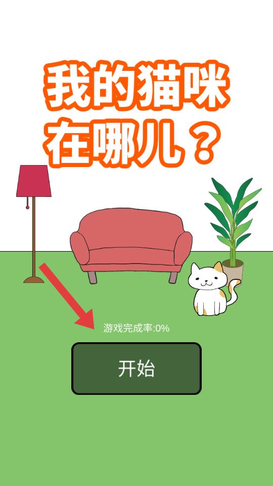 1、游戲開始,界面顯示我的貓咪在哪兒,下方有開始按鈕,點擊后進入關(guān)卡選擇界面,準(zhǔn)備尋找貓咪。