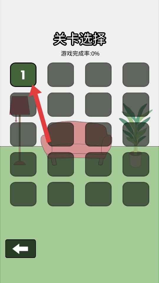 2、在關(guān)卡選擇界面,能看到多個關(guān)卡格子,初始只有1號關(guān)卡可選擇,點擊進入第一關(guān),開啟找貓咪的挑戰(zhàn)。