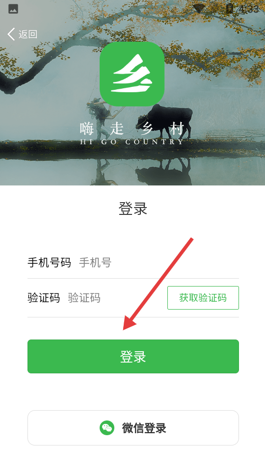 1、嗨走鄉(xiāng)村登錄頁背景是鄉(xiāng)村畫面,可通過手機號驗證碼或微信登錄,開啟鄉(xiāng)村之旅探索。