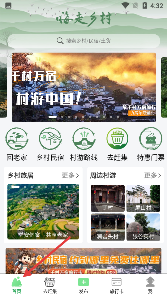 2、首頁聚焦鄉(xiāng)村游含搜索功能,推千村萬宿活動,設鄉(xiāng)村民宿等板塊,展示鄉(xiāng)村旅居與周邊村游好去處。