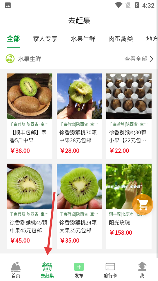 3、去趕集界面分家人專享等農(nóng)產(chǎn)品類別,展示陜西獼猴桃等生鮮,標注價格、產(chǎn)地及包郵信息方便選購。