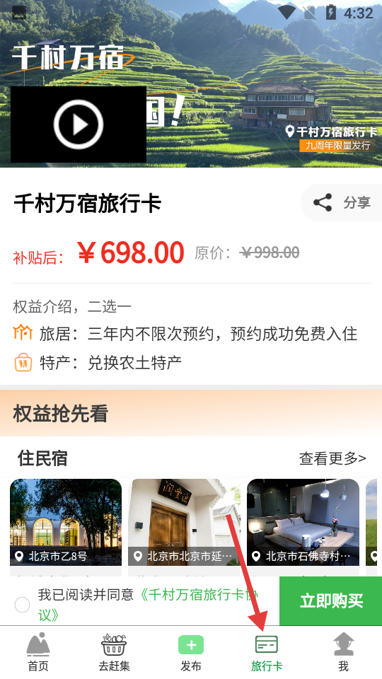 4、旅行卡頁面推千村萬宿旅行卡,列補貼價與原價,介紹三年免費住民宿、兌特產(chǎn)權益,有購買和查看更多民宿入口。