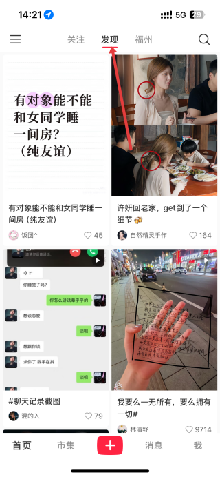 4、完成興趣選擇后,進入小紅書發(fā)現(xiàn)頁面,能看到各類推薦內(nèi)容,可瀏覽感興趣的筆記,也能進行關(guān)注、搜索等操作。