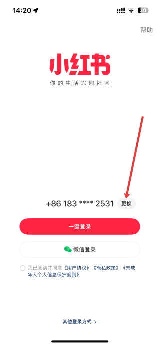 1、打開小紅書,進入登錄頁面,可看到顯示的手機號碼,若需更換,點擊更換,也可選擇一鍵登錄、微信登錄等方式,登錄前需勾選同意相關(guān)協(xié)議。