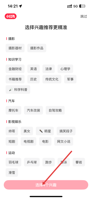 3、登錄成功后,進入選擇興趣頁面,有攝影、知識學習等各類興趣分類,可選擇感興趣的類別,之后能獲得更精準的推薦。
