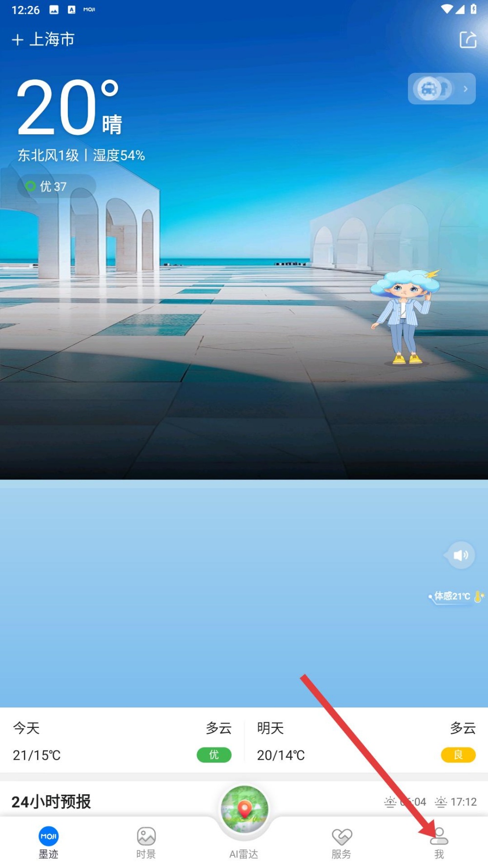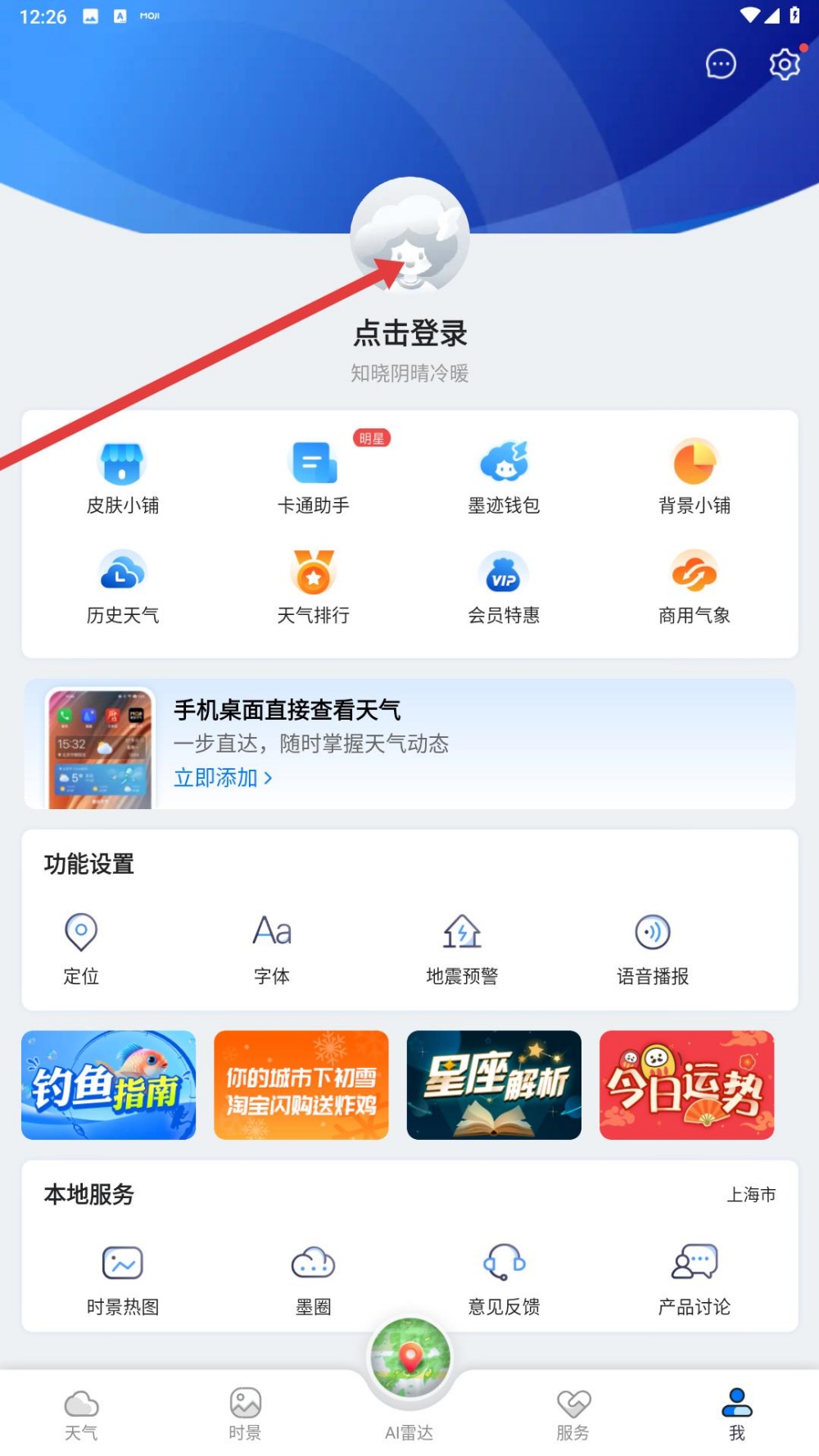 1、墨跡天氣APP主界面,點擊右下角我的,進入個人中心界面,可進行賬號登錄操作。