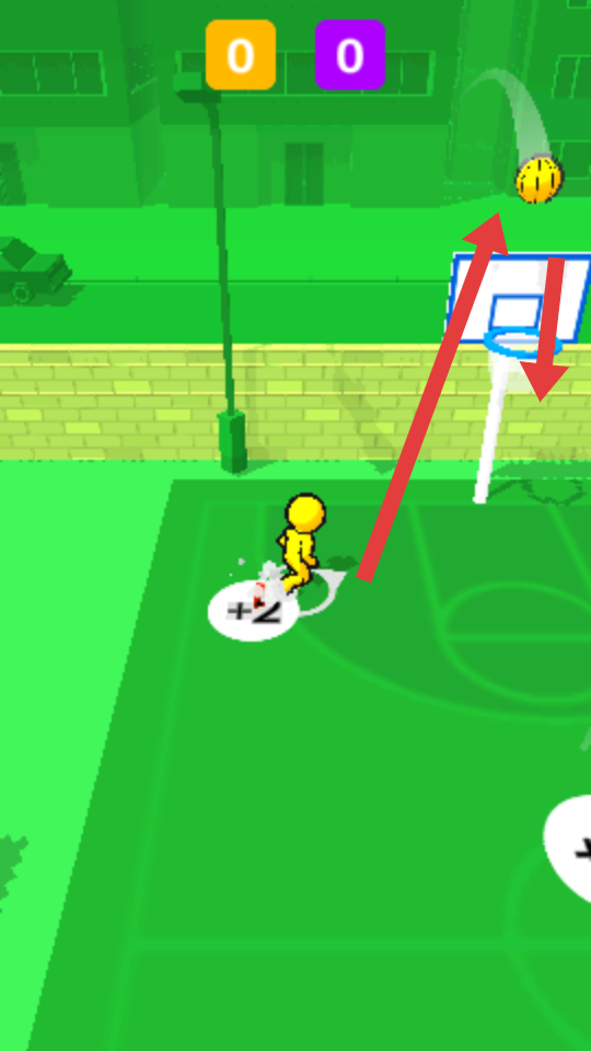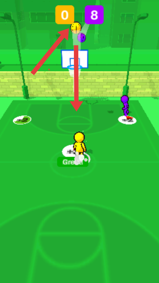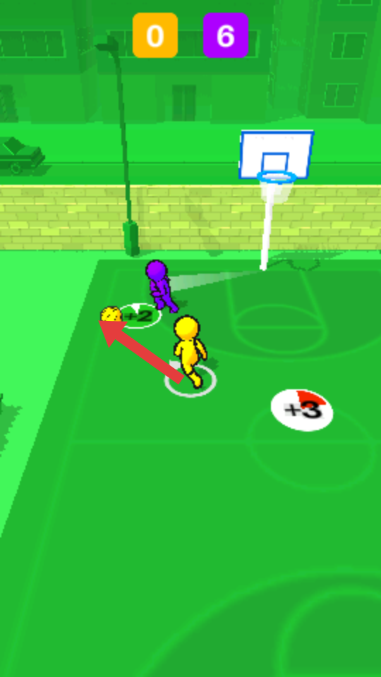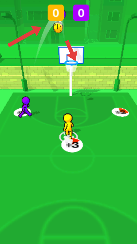 1、操控黃人在球場上移動,瞄準籃筐,將籃球投出,嘗試讓籃球精準落入籃筐,同時留意對手紫人的動向。