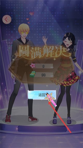 4、當(dāng)完成相關(guān)任務(wù)或挑戰(zhàn)后,會(huì)出現(xiàn)圓滿解決的提示,還能獲得星星、金幣等獎(jiǎng)勵(lì),之后可點(diǎn)擊返回繼續(xù)游戲。