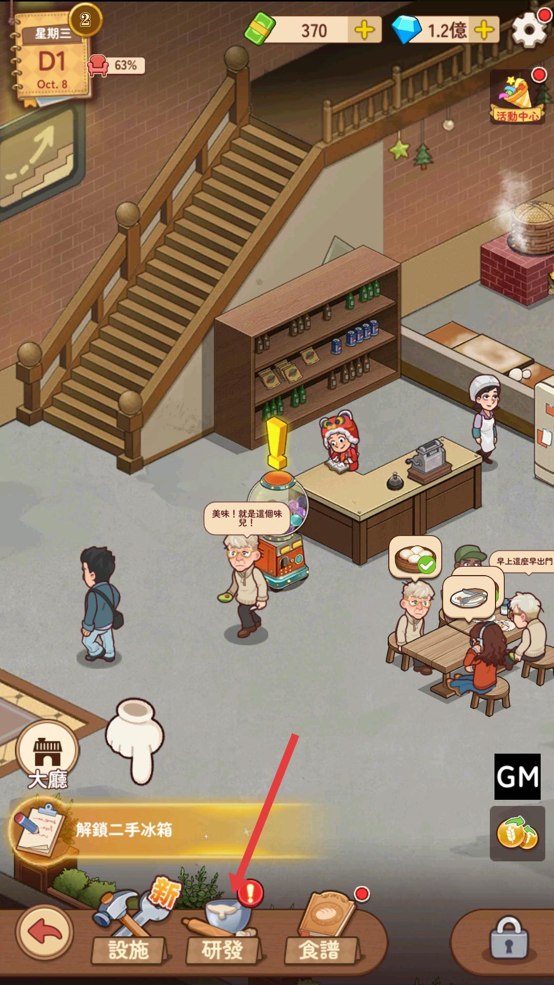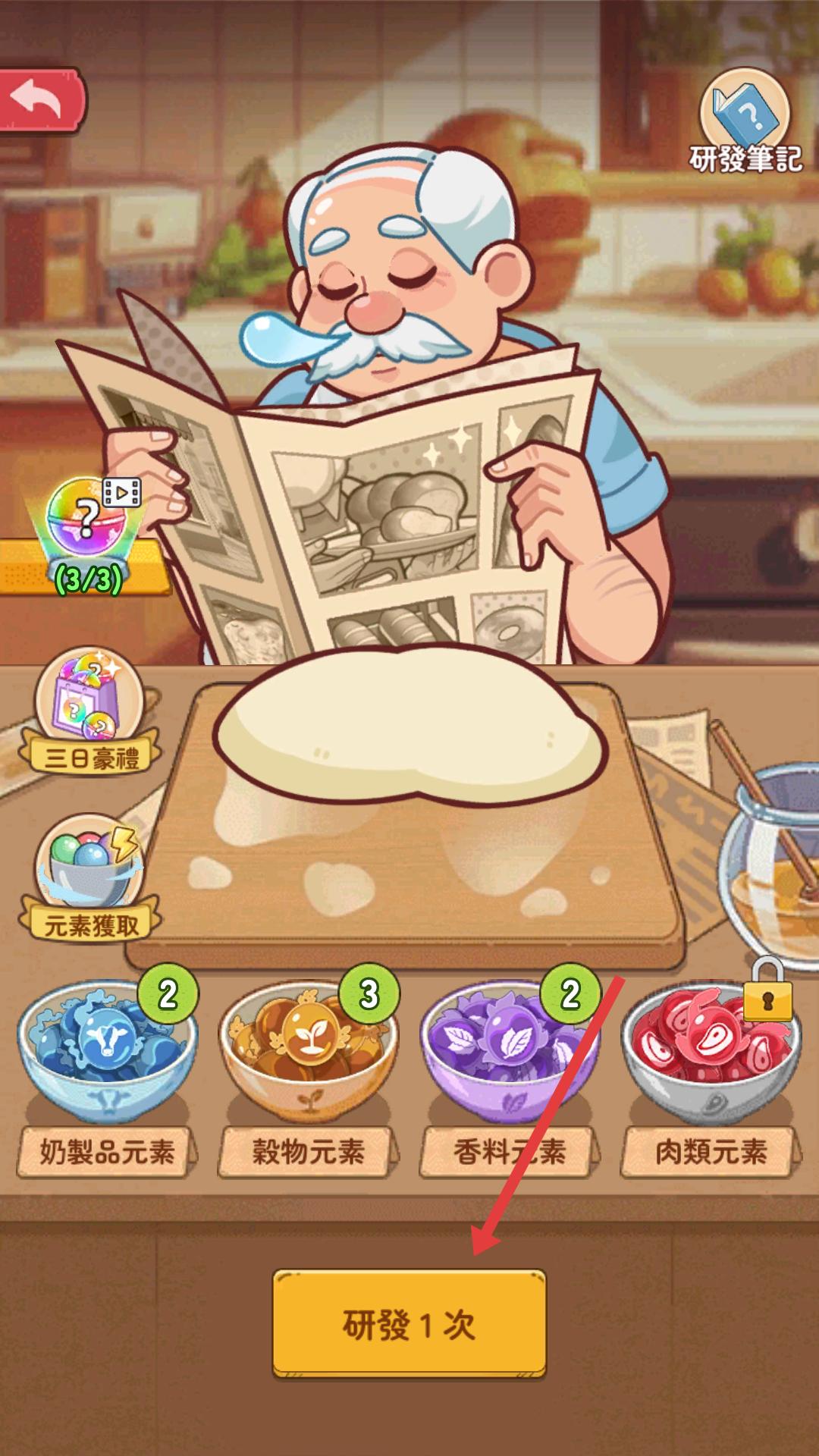 4、在研發(fā)界面,點(diǎn)擊研發(fā)1次,進(jìn)行美食研發(fā),嘗試創(chuàng)造新的美味食品,為店鋪增添新的菜品。