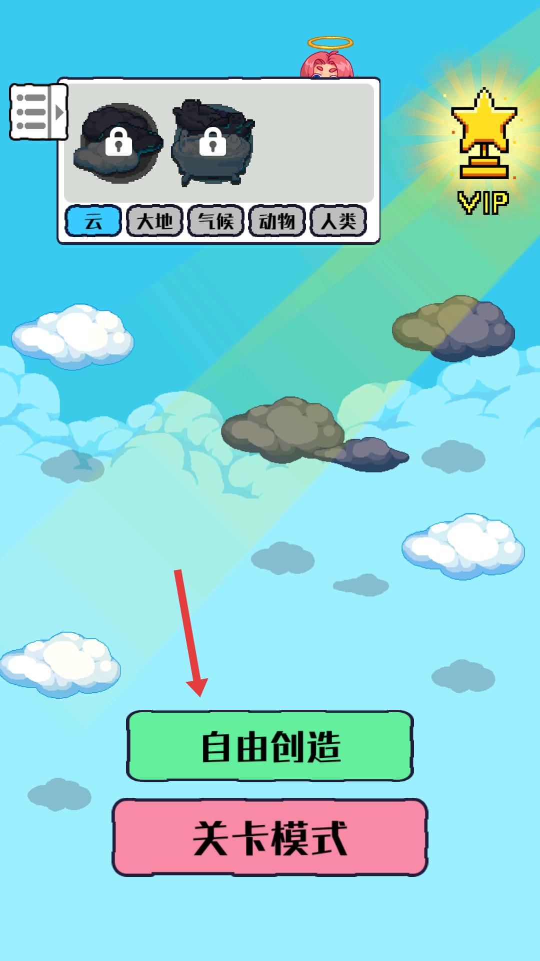 1、點擊自由創(chuàng)造,進入自由創(chuàng)造模式,可盡情發(fā)揮創(chuàng)意,打造屬于自己的世界,從云、大地等基礎(chǔ)元素開始構(gòu)建。