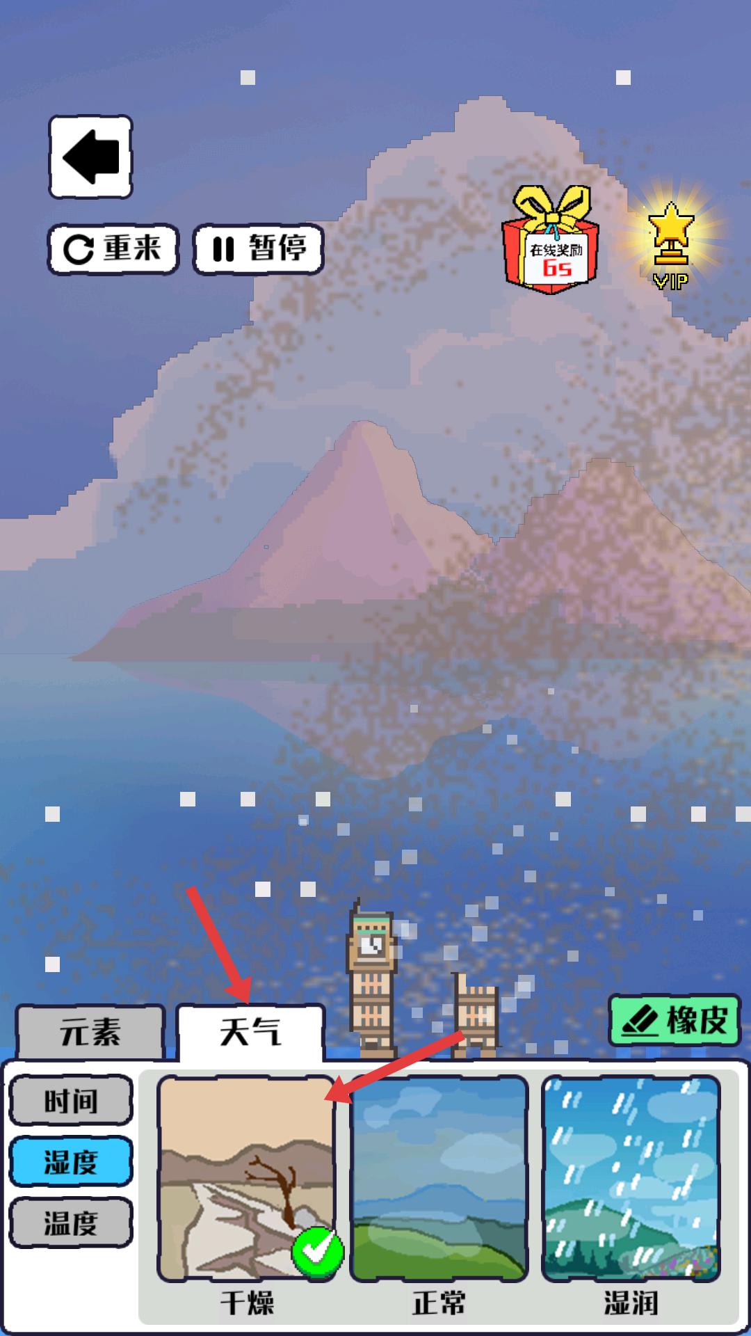 3、切換到天氣選項,選擇干燥天氣類型,改變場景的濕度環(huán)境,觀察場景因干燥天氣產(chǎn)生的變化,調(diào)整世界狀態(tài)。