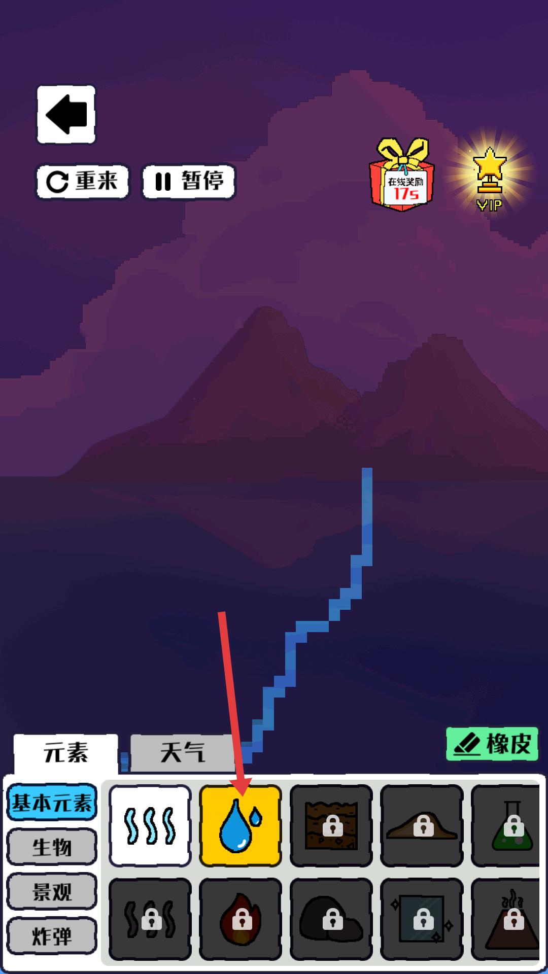 2、在創(chuàng)造界面,選擇基本元素中的水滴元素,將其添加到場景中,為后續(xù)創(chuàng)造天氣、景觀等奠定基礎(chǔ),豐富世界構(gòu)成。